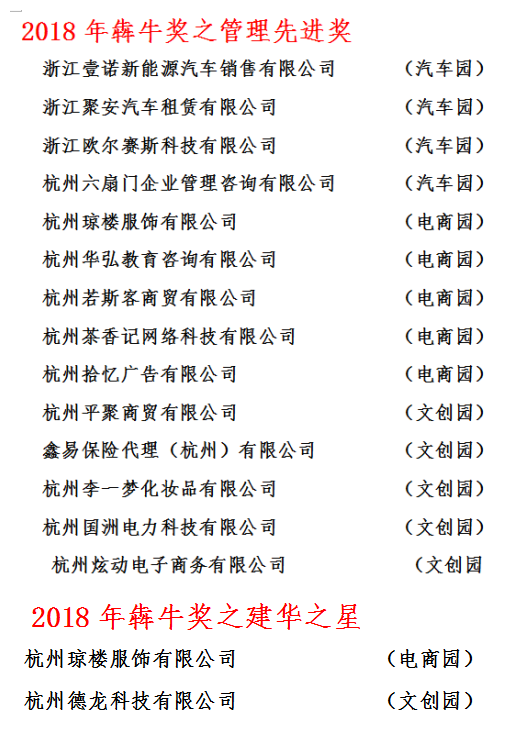 2018年建华文创园区持续稳定发展,园区配套和投资环境不断优化,园区经济向着高质量方向迈进。在园区发展的实践中,涌现出了一批经济效益好、税收贡献大的骨干企业。为鼓励先进企业做强做优,营造依法纳税良好氛围,建华文创集团评选出2018年度管理先进奖、建华之星、纳税之星、迁税奖、引荐奖五大“犇牛奖”奖项。五大奖项涵盖了纳税、招商引资、创新发展、服务发展等领域,代表了在不同领域所付出的努力和取得的成就,具有广泛的代表性和示范性。