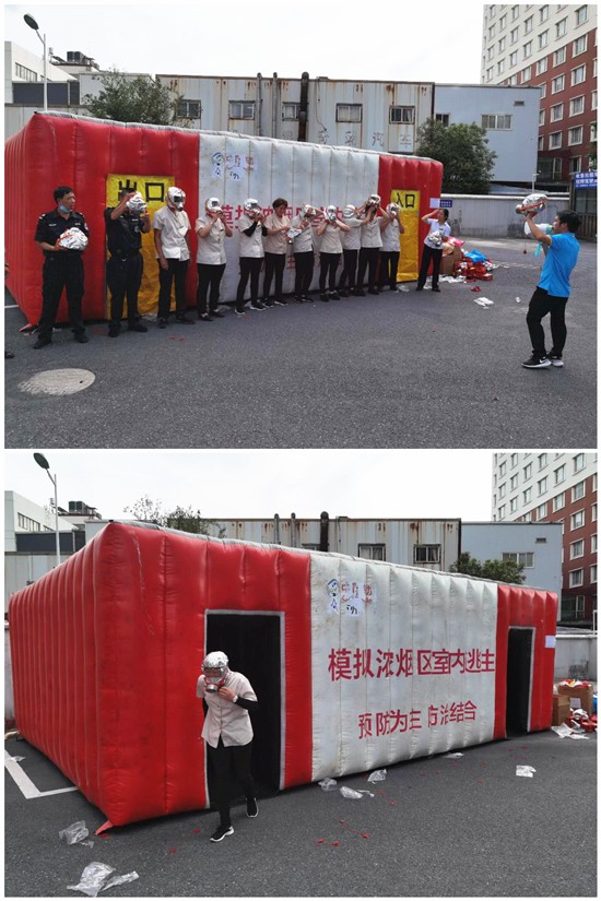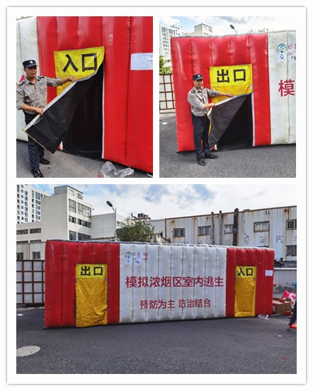 本次活动特邀专业人士进行现场培训,随后利用消防逃生帐篷,保洁、保安分组进行应急疏散演练。逃生帐篷的进口和出口分开设置,全密闭空间,设有遮光用的门帘,演习时将制造烟雾,模拟真实的火灾现场,要求人员在20秒前必须逃生出来,否则视为逃生失败。现场,全体人员带上防护罩,弯腰、低头,依次从帐篷入口进入,并快速撤离消防烟雾帐篷。本次模拟高温、浓烟环境火场逃生的演练活动,零距离接触和感受火灾安全自救防护知识,使参训人员有了一次真真切切的应急逃生体验,有效提升了火灾逃生自救能力。