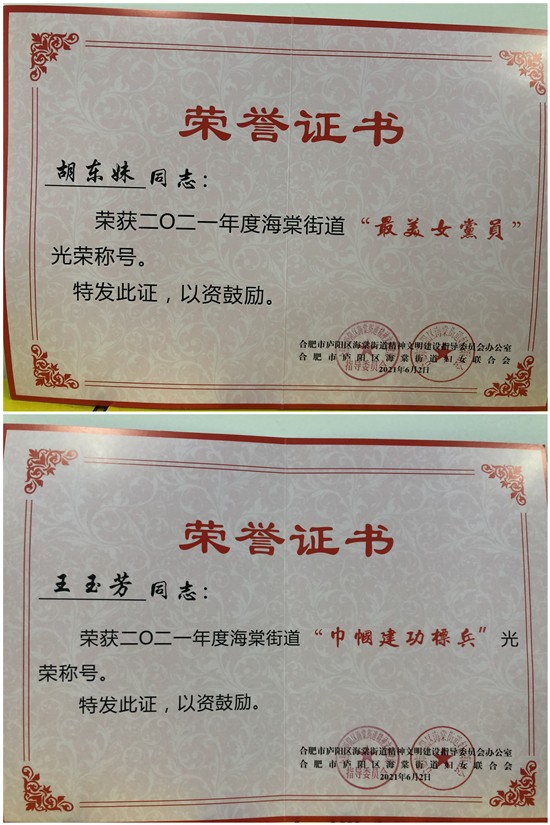为进一步提高政治站位,将学习宣传贯彻习近平新时代中国特色社会主义思想作为新时代家庭工作的首要任务,以习近平总书记关于家庭家教家风的重要论述为指引,以“家家幸福安康工程”为抓手,培育新时代家庭观,以优异成绩迎接建党100周年。庐阳区海棠街道妇联、文明办在2021年开展评选 “最美女党员”、“五好文明家庭”、“巾帼建功标兵”活动。经过层层的评选、公示,庐阳建华文创园胡东妹、王玉芳获得荣誉称号。她们表示,在今后的工作中会继续发挥共产党员先锋模范作用,全身心、高标准干好本职工作。