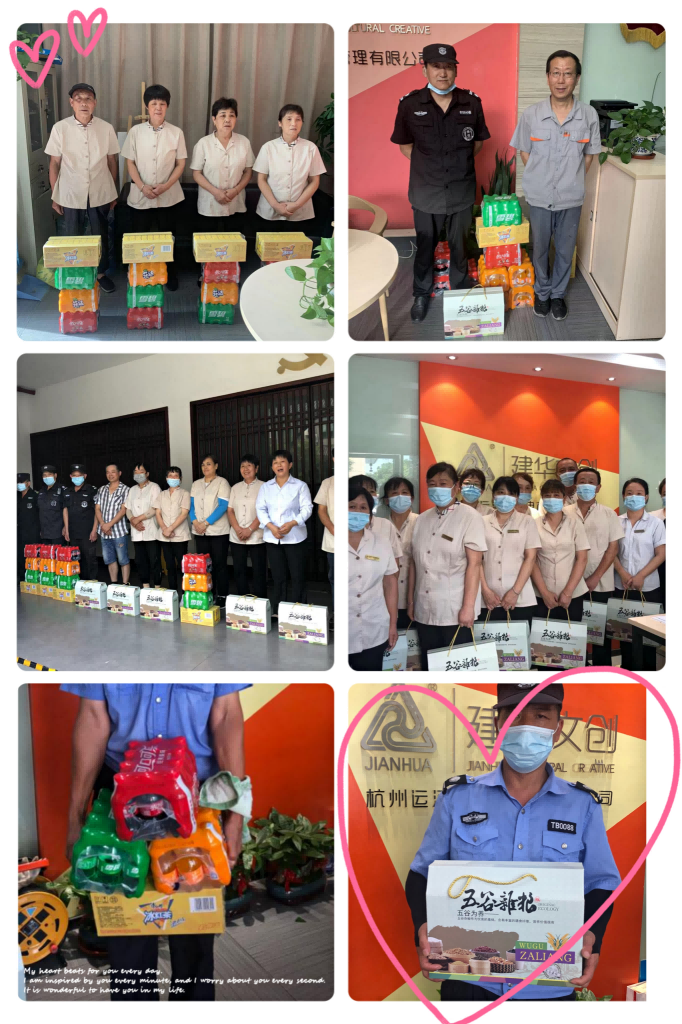 近日,面对三伏天的高温烈日,建华文创集团保安、保洁等第三方团队发扬敢于吃苦、勇于奉献的精神,坚守自己的岗位,为此集团各园区开展“防酷暑、送清凉”慰问活动。