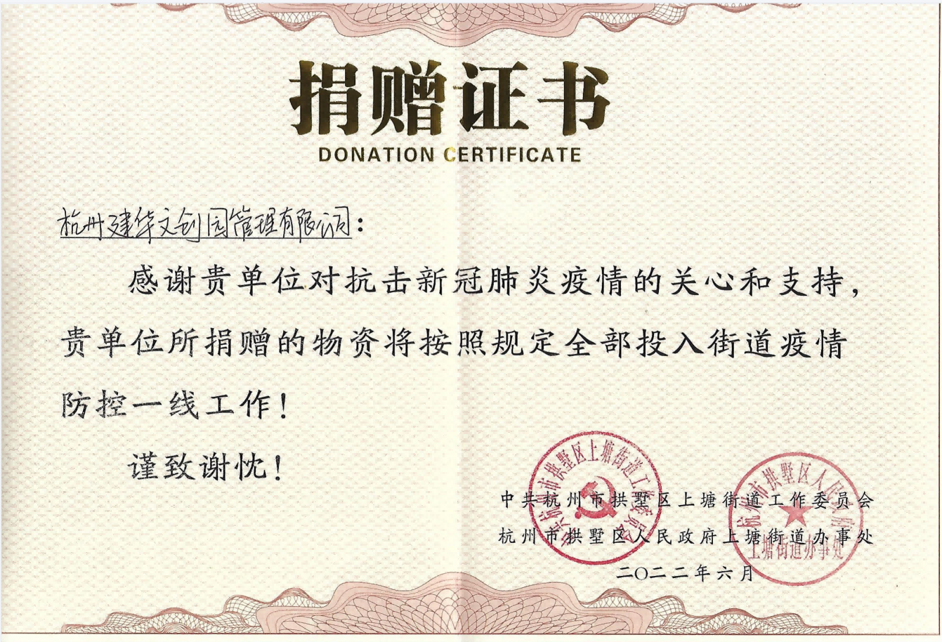 近日,建华文创园收到了杭州市拱墅区上塘街道办事处颁发的荣誉证书,以表彰建华文创园在疫情中挺身而出,驰援上塘街道战疫一线、有效化解防疫物资紧张等问题。
